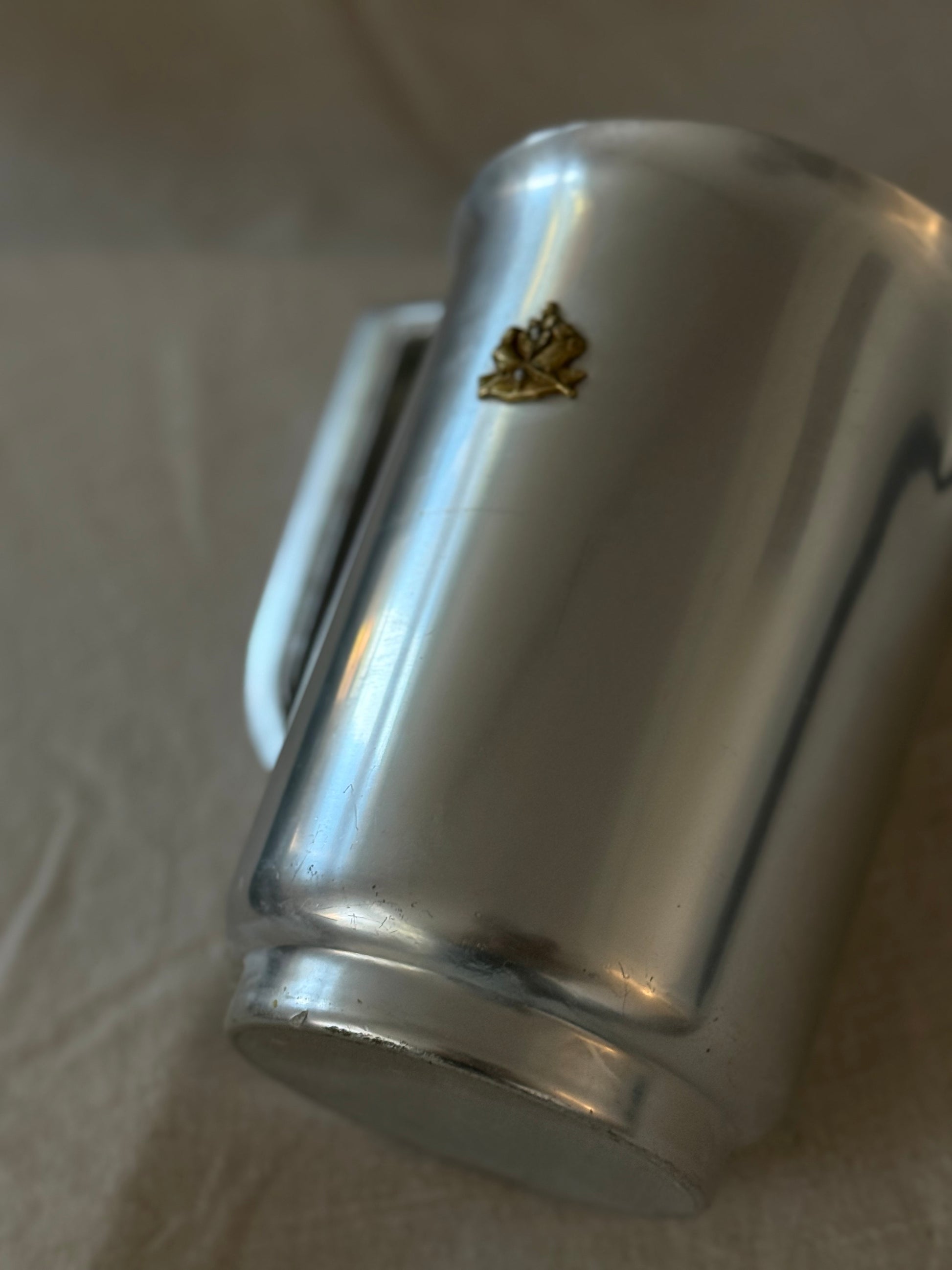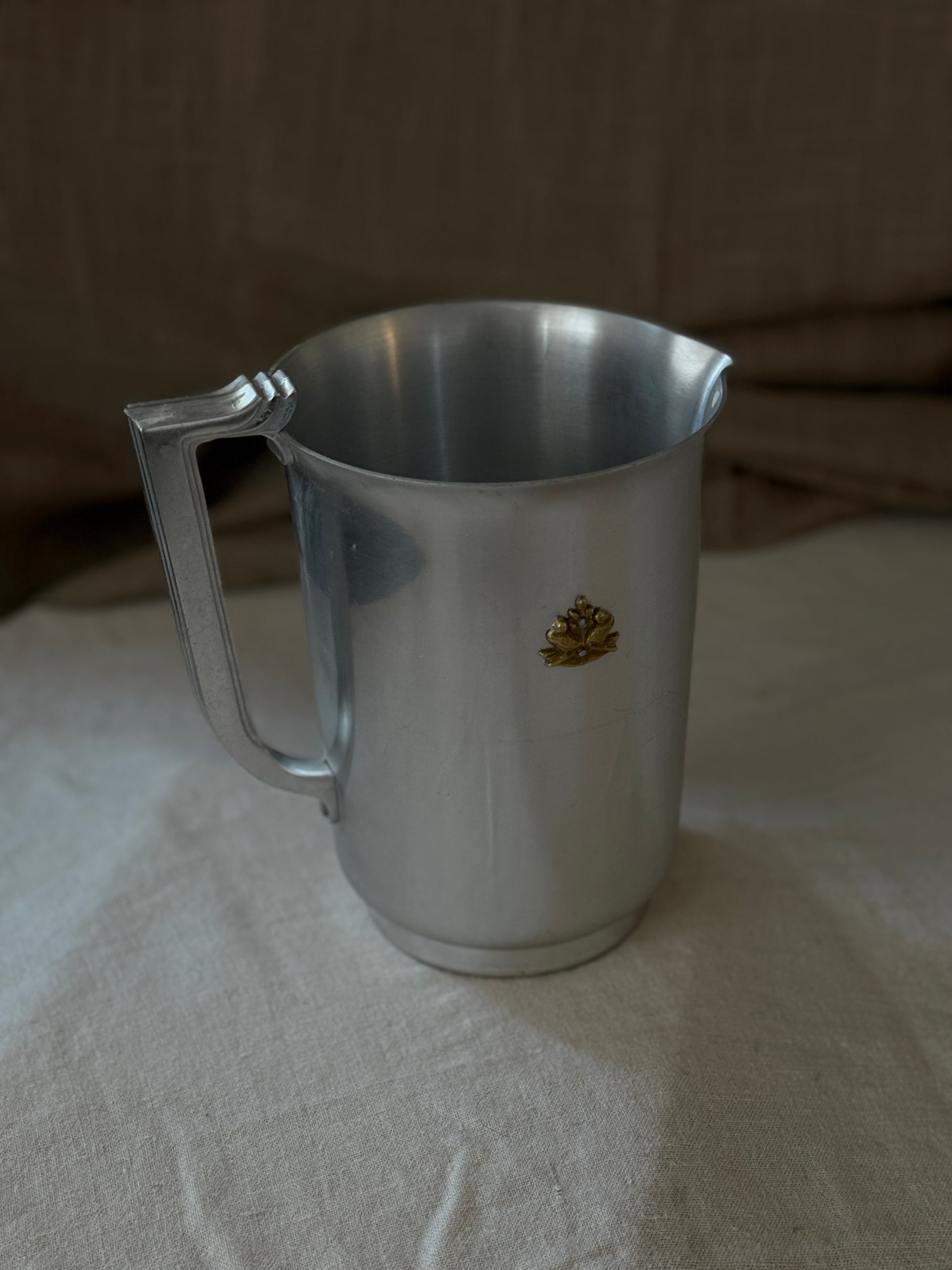 Art Deco aluminum silver pitcher with brass bird emblem In good used condition with no chips and no cracks, but wear marks/scratches as pictured, consistent with age.